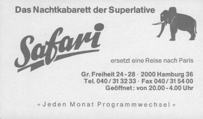 Das Programm soll hier nicht ausführlich beschrieben werden. Nur soviel sei gesagt: Nobel mußte einer Dame behilflich sein, die Probleme mit ihrem BH hatte. Klaus hatte es sich nicht so vorgestellt, daß es auf der Bühne richtig zur Sache ging. Pepi hatte es vorgezogen, eine Reihe hinter Klaus und Nobel Platz zu nehmen, mit der Folge, daß die beiden ihn zum Schluß vor einer zudringlichen Dame retten mußten, die nur Piccolos (DM 80,-) trinken wollte. Gegen 2.45 Uhr verließen die Drei das Safari, um mit dem Taxi zum Hotel zu fahren.